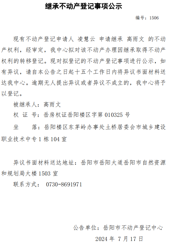 继承不动产登记公示 编号:凌慧云(1506)