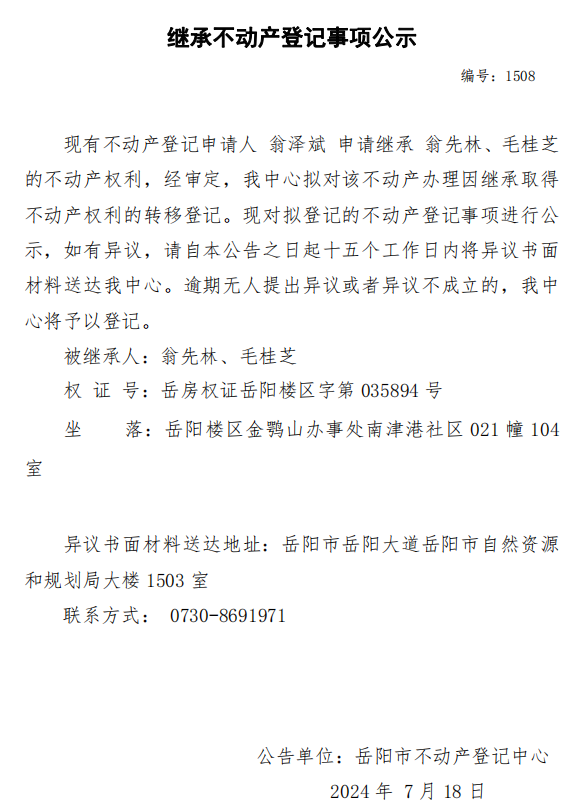 继承不动产登记公示 编号:翁泽斌(1508)