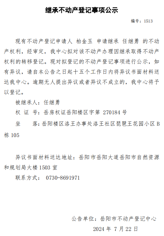 继承不动产登记公示 编号:柏金玉(1513)