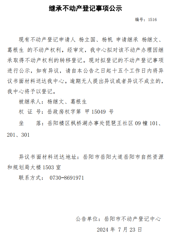 继承不动产登记公示 编号:杨立国、杨帆(1516)