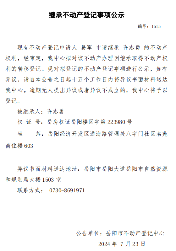 继承不动产登记公示 编号:易军(1515)
