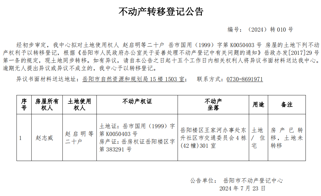 不动产转移登记公告 编号:(2024)转010(赵启明等二十户)