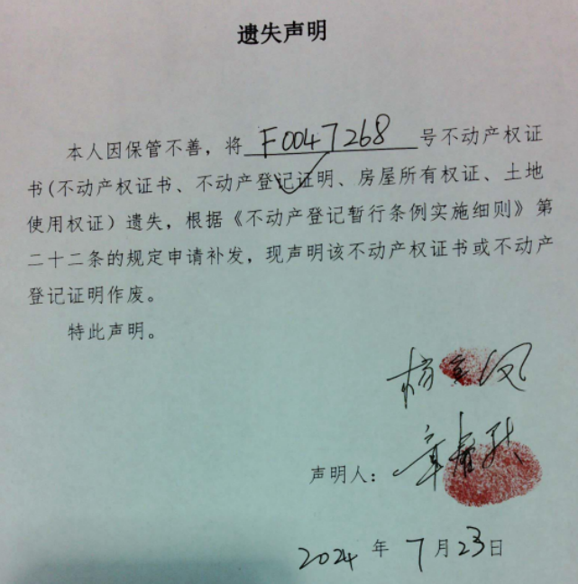 遗失声明(杨金凤、章春秋)