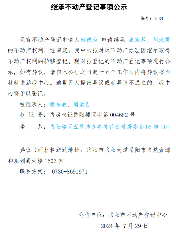 继承不动产登记公示 编号:康德为(1534)
