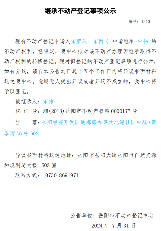 继承不动产登记公示 编号:宋彦辰、宋雨芯(1540)