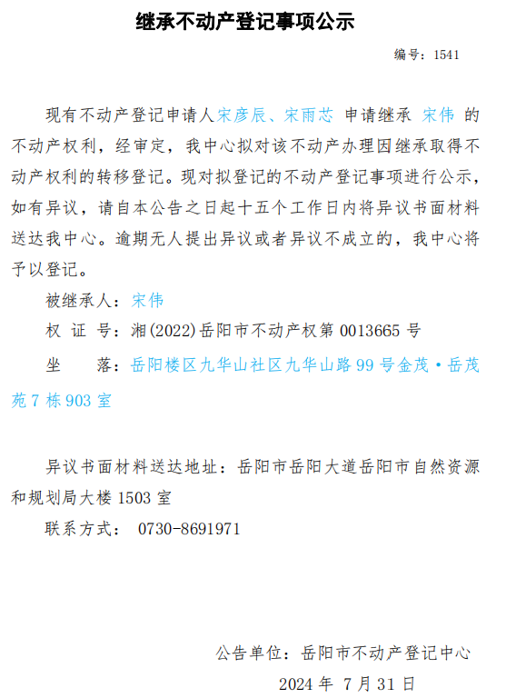 继承不动产登记公示 编号:宋彦辰、宋雨芯(1541)