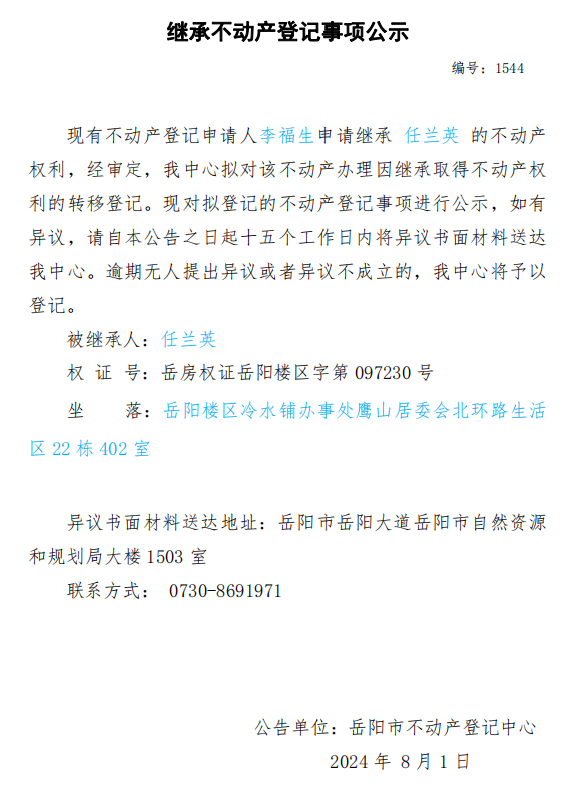 继承不动产登记公示 编号:李福生(1544)