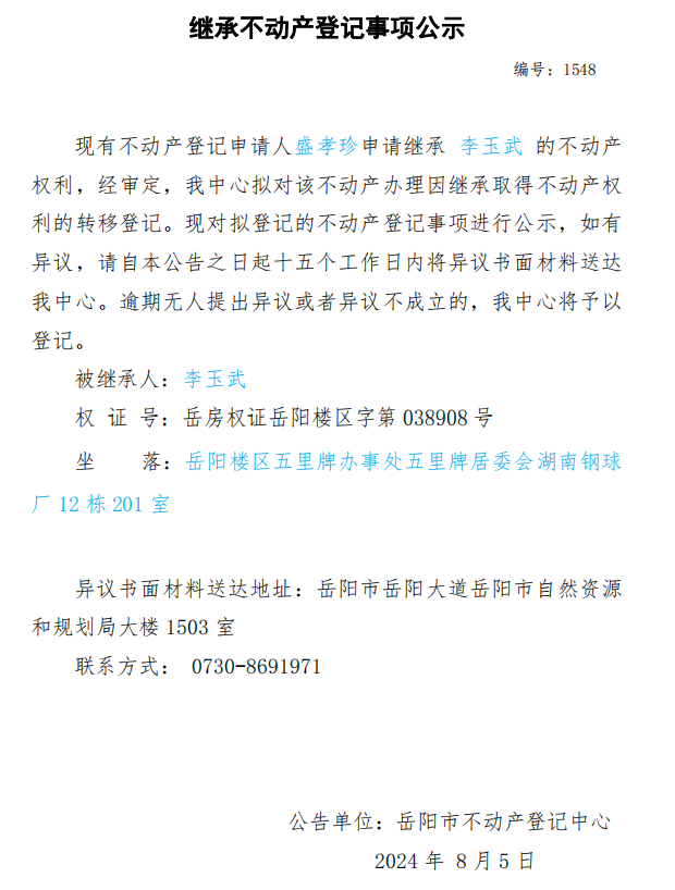 继承不动产登记公示 编号:盛孝珍(1548)