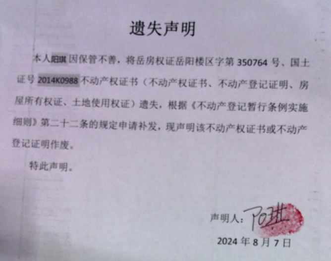 遗失声明(阳琪)