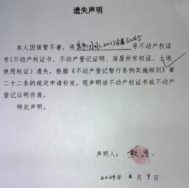 遗失声明(熊思)
