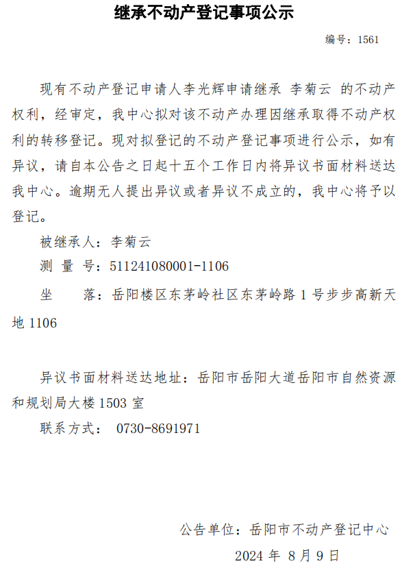 继承不动产登记公示 编号:李光辉(1561)