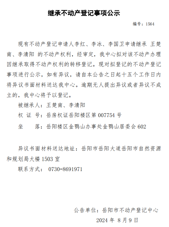 继承不动产登记公示 编号:李红、李冰、李国卫(1564)