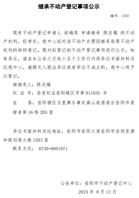 继承不动产登记公示 编号:赵梅英(1570)