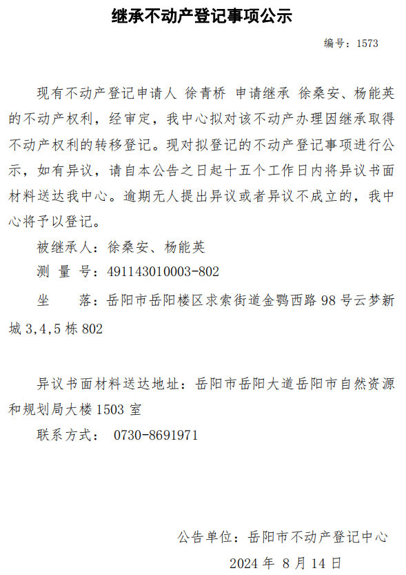 继承不动产登记公示 编号:徐青桥(1573)