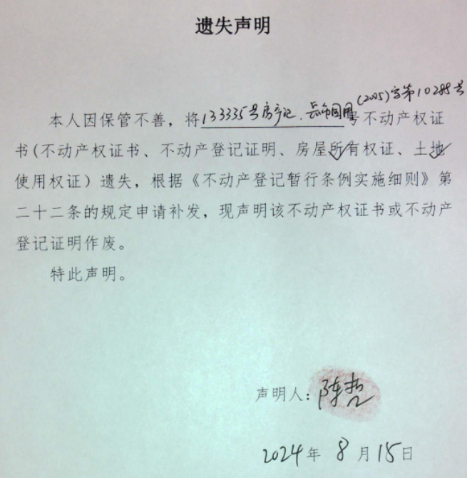 遗失声明(陈哲 )