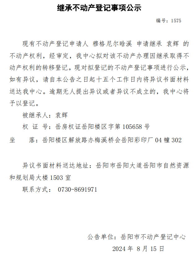继承不动产登记公示 编号:穆格尼尔晗溪(1575)
