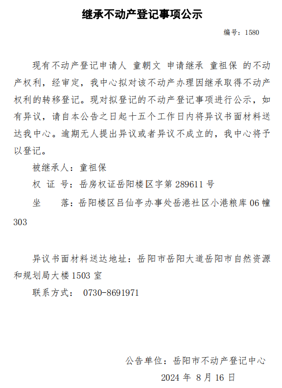 继承不动产登记公示 编号:童朝文(1580)