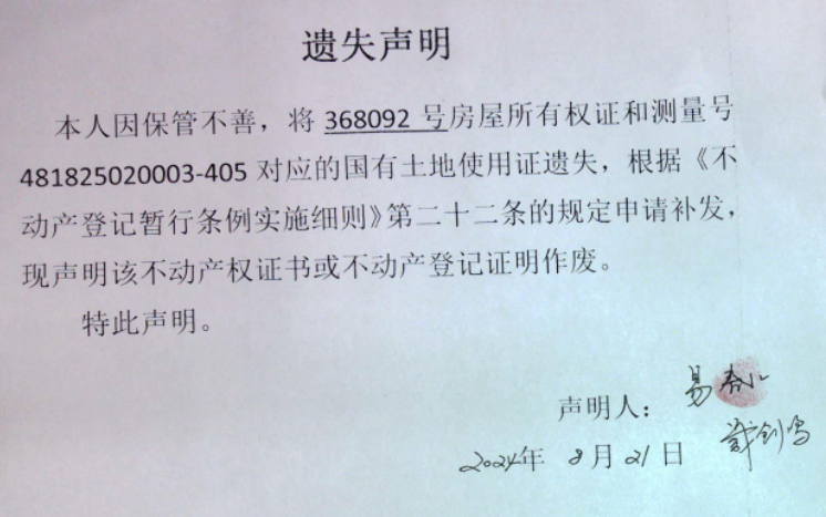 遗失声明(易春红、戴剑鸣)