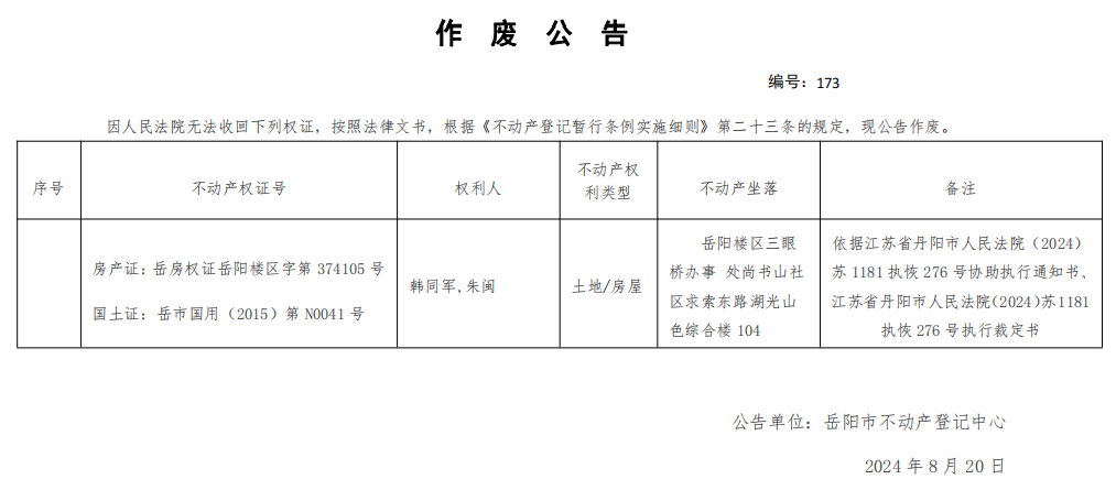 作废公告 编号:韩同军,朱闽(173)