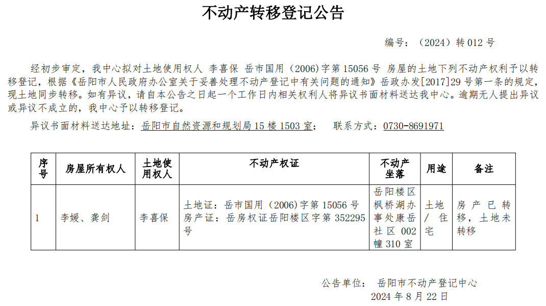 不动产转移登记公告 编号:(2024)转012(李喜保)