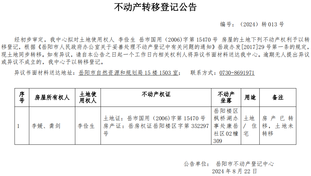不动产转移登记公告 编号:(2024)转013(李俭生)