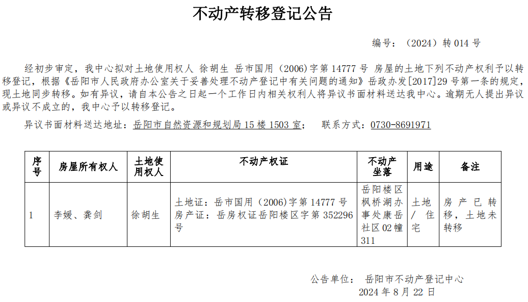不动产转移登记公告 编号:(2024)转014(徐胡生)