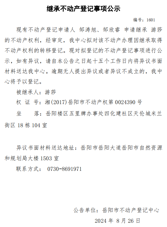 继承不动产登记公示 编号:邹涛旭、邹欣睿(1601)