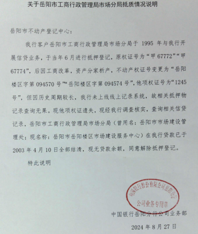 遗失说明公示(中国银行股份有限公司岳阳分行)