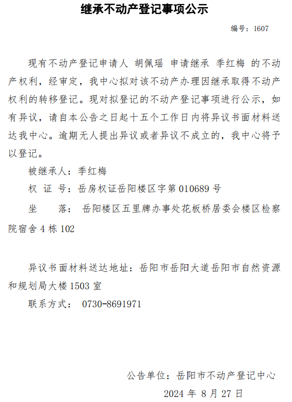 继承不动产登记公示 编号:胡佩瑶(1607)
