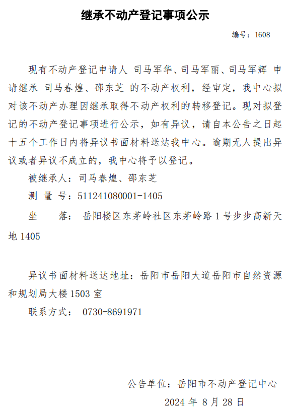 继承不动产登记公示 编号:司马军华、司马军丽、司马军辉(1608)
