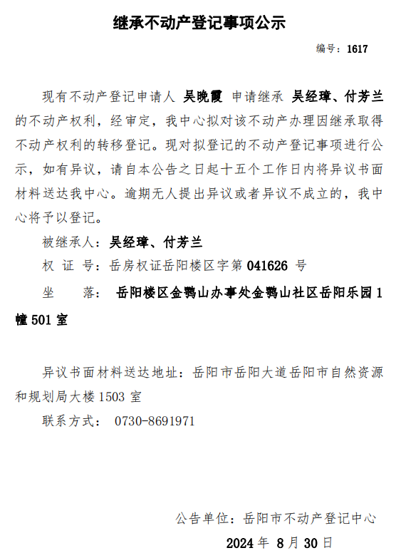 继承不动产登记公示 编号:吴晚霞(1617)