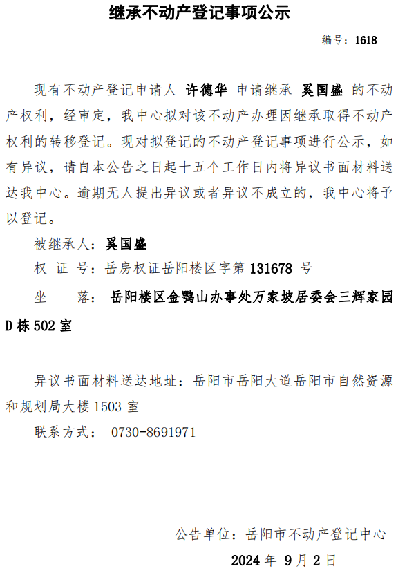 继承不动产登记公示 编号:许德华(1618)