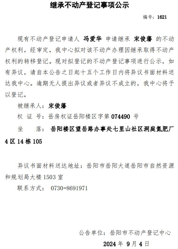 继承不动产登记公示 编号:冯爱华(1621)