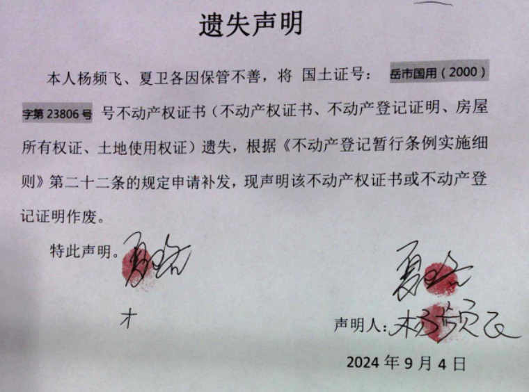 遗失声明(夏卫各、杨频飞)