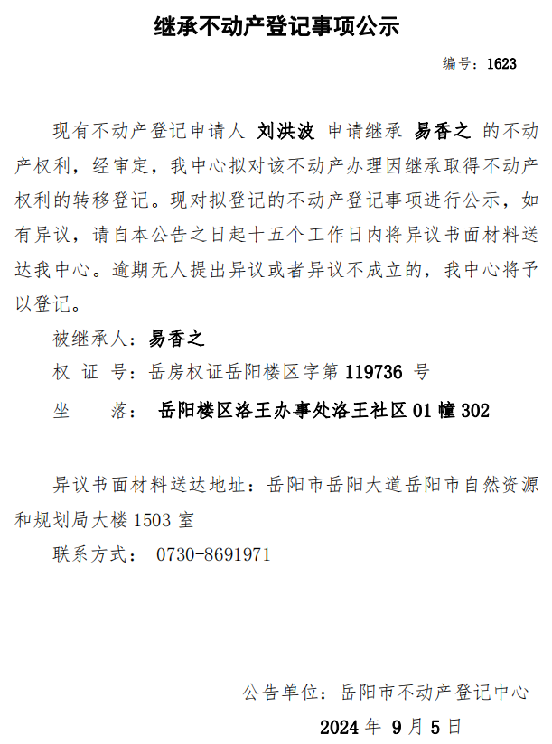 继承不动产登记公示 编号:刘洪波(1623)