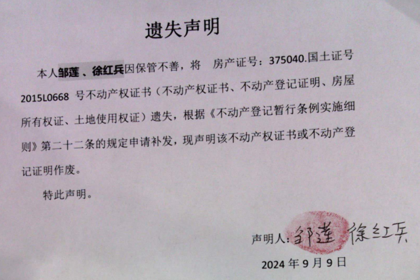 遗失声明( 邹莲、徐红兵 )