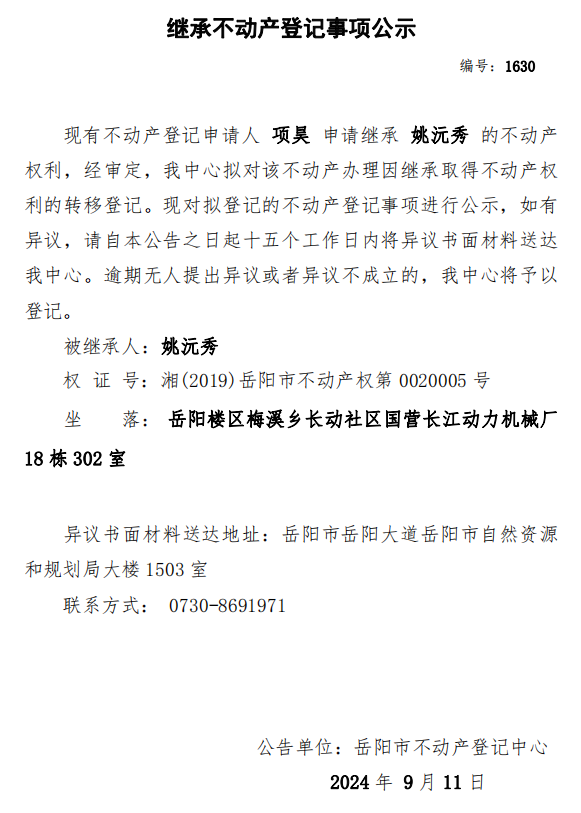 继承不动产登记公示 编号:项昊(1630)