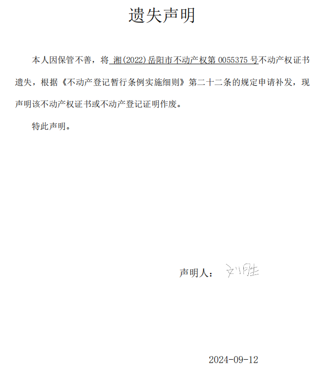 遗失声明 (刘胜)