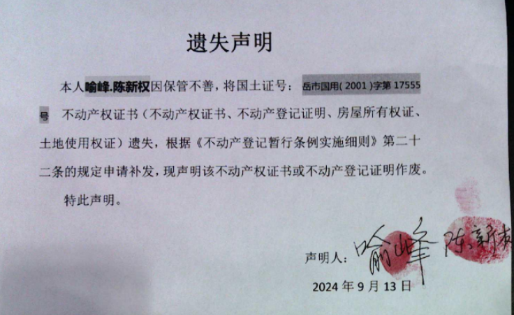 遗失声明(喻峰、陈新权)