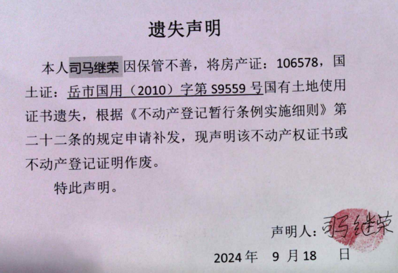 遗失声明(司马继荣 )