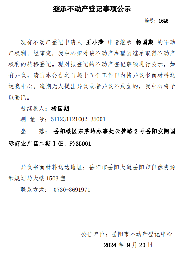 继承不动产登记公示 编号:王小荣(1645)