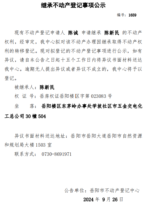 继承不动产登记公示 编号:陈诚(1659)
