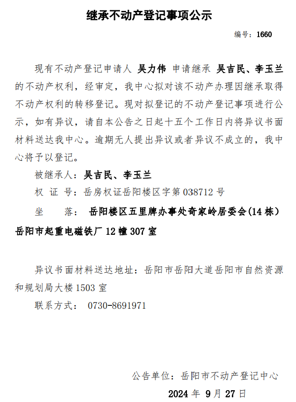 继承不动产登记公示 编号:吴力伟(1660)