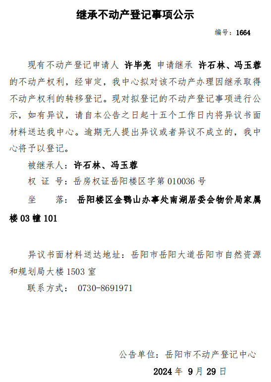 继承不动产登记公示 编号:许毕亮(1664)