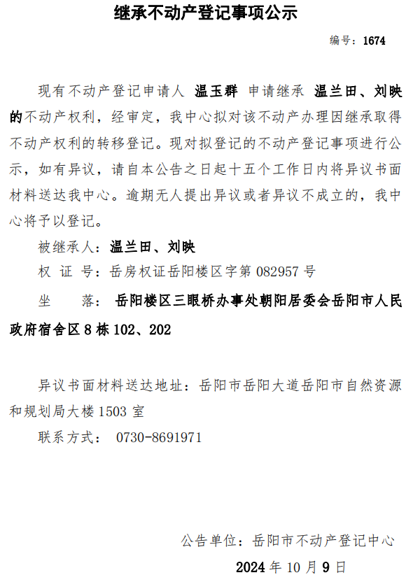 继承不动产登记公示 编号:温玉群(1674)