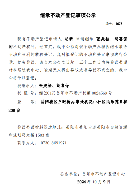 继承不动产登记公示 编号:胡新(1675)