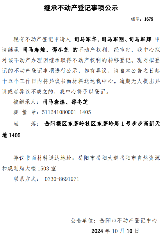 继承不动产登记公示 编号:司马军华、司马军丽、司马军辉(1679)