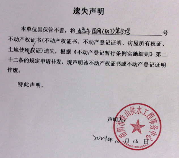 遗失声明(岳阳市铁山供水工程事务中心)