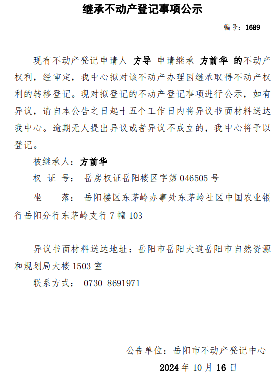 继承不动产登记公示 编号:方导(1689)