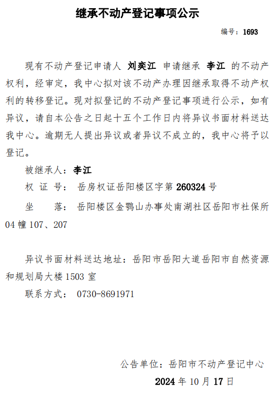 继承不动产登记公示 编号:刘奕江(1693)
